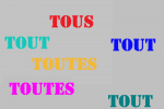 TOUT TOUS TOUTE TOUTES. Ce mot est très fréquent en français et occasionne souvent des erreurs d'orthographe. Pour surmonter cette difficulté, n'hésitez pas à faire des exercices un peu répétitifs, qui vous permettront d'installer des automatismes. Rappel du cours : Ce mot peut avoir 4 natures grammaticales différentes, et son orthographe dépend de sa nature grammaticale: - LE PLUS SOUVENT C’EST UN ADJECTIF (déterminant indéfini), ou un PRONOM. Adjectif et pronom, le masculin pluriel s’écrit “tous”. -