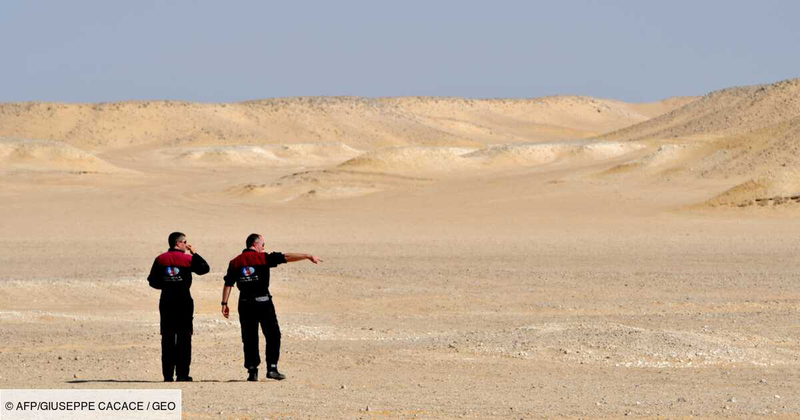 En combinaisons intégrales sous un soleil de plomb, une équipe d'astronautes autrichiens prépare un camp dans les étendues désertiques du Dhofar, à Oman. Une...