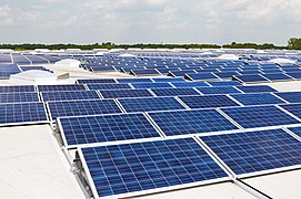 ( Le potentiel de l'énergie solaire est tel que l'énergie émise par le soleil et reçue par la Terre en environ une heure permettrait, si elle était récupérée en totalité, de pourvoir aux besoins énergétiques de l'humanité pendant un an. En théorie, un carré de panneaux solaires de 344 km de côté (120 000 km2) pourrait couvrir la totalité des besoins mondiaux en électricité, le rendement d'une installation photovoltaïque étant estimé entre 15 et 17 % (en 2007 en Europe), soit 160 kWh/an/m2 (ou 160 GWh/an/km2N 2) avec des besoins mondiaux estimés à 19 000 TWh en 20068). Dans le cas de l'Europe des Vingt-Sept, qui consomme 3 000 TWh par an, une surface de 137 km de côté (soit 19 000 km2) serait nécessaire, tandis que dans le cas de la France (500 TWh), elle devrait atteindre 56 km de côté (3 100 km2). )